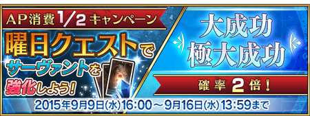 Fatego 9月9日より曜日クエストap消費1 2 大成功 極大成功確率2倍キャンペーン フェイトグランドオーダー攻略まとめ速報